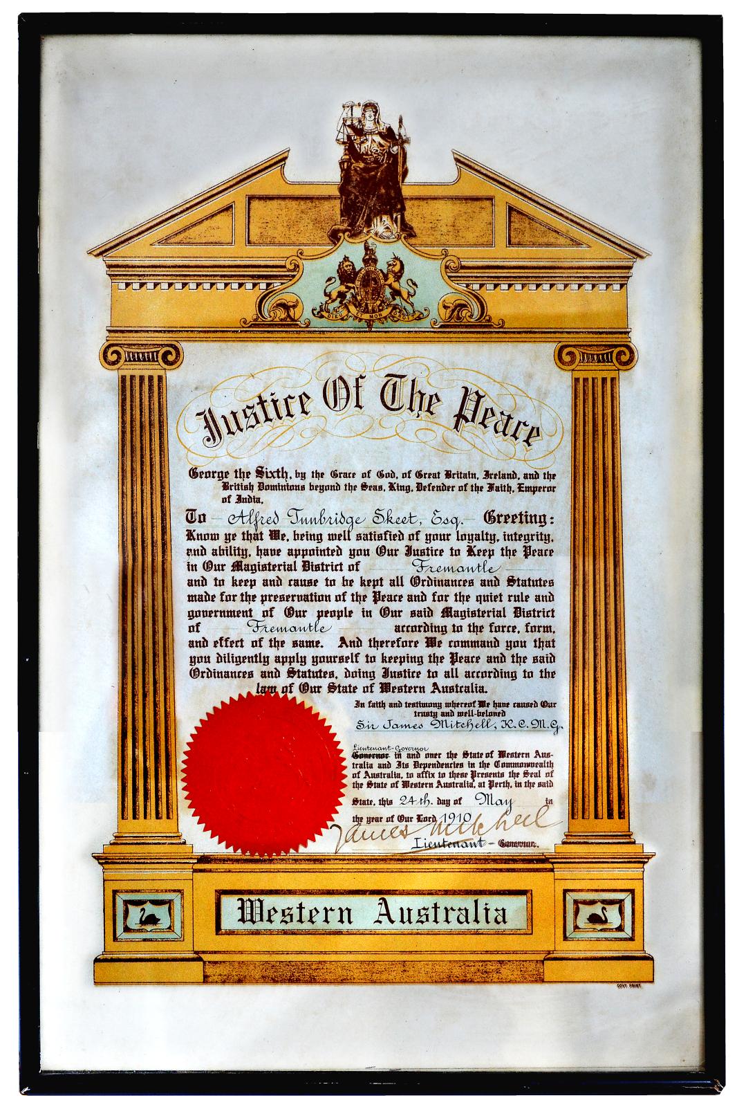 1910 - 1945The certificate has cream background with a Roman shaped entrance in mustard colour. At the top is a statue of Joan of Arc, underneath is an English badge. Between the left column and the right column are the words [JUSTICE OF THE PEACE] shaped in an arc, in Old English font. Under that George the Sixth, by the Grace of God, of Great Britain, Ireland, and the/ British Dominions beyond the Seas, King, Defender of the Faith, Emperor/ of India. To Alfred Tunbridge Skeet, Esq Greeting. Signed at the bottom by Sir James Mitchell, K.C.M.G. Has the stamp of Western Australia in orange colour. At the bottom of the border on each side is a black swan within a blue square. Between the squares in a blue rectangle printed in brown are the words [WESTERN AUSTRALIA]. The timber frame is black and chipped in the bottom corners.