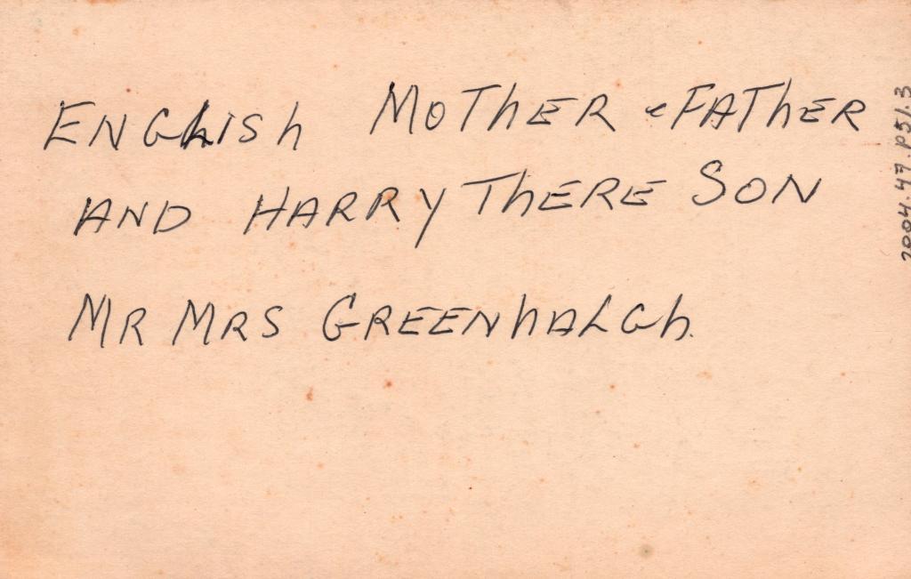 Reverse: Written in black pen 'ENGLISH MOTHER & FATHER AND HARRY THERE SON MR MRS GREENHALGH'