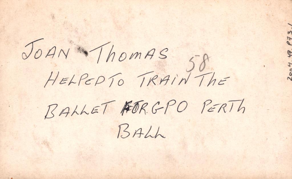 Reverse: Written in black pen 'JOAN THOMAS HELPED TO TRAIN THE BALLET FOR GPO PERTH BALL'