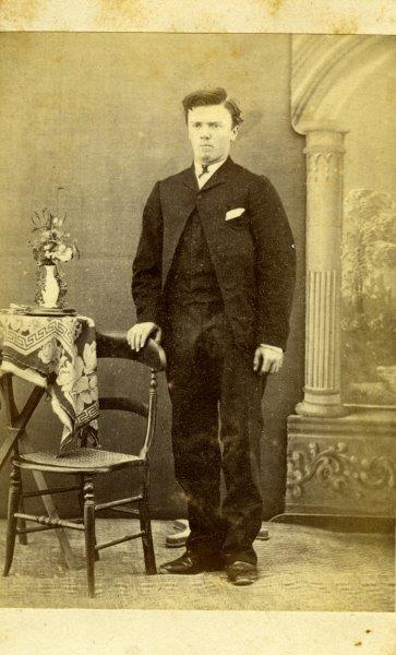 c. 1874B/W copy of sepia studio portrait of a serious looking young man. His thick hair is neatly parted and combed. He is wearing a white shirt and a three piece suit with small revers and a single button. He is standing in front of some form of pedestal and his right hand is resting on the back of a chair. There is an incongrous assortment of studio 'furniture': a wooden chair with turning and wicker seat, a three-legged table with patterned cloth and vase of flowers and a painted backdrop with classical pillar, archway, frieze and pastoral scene.