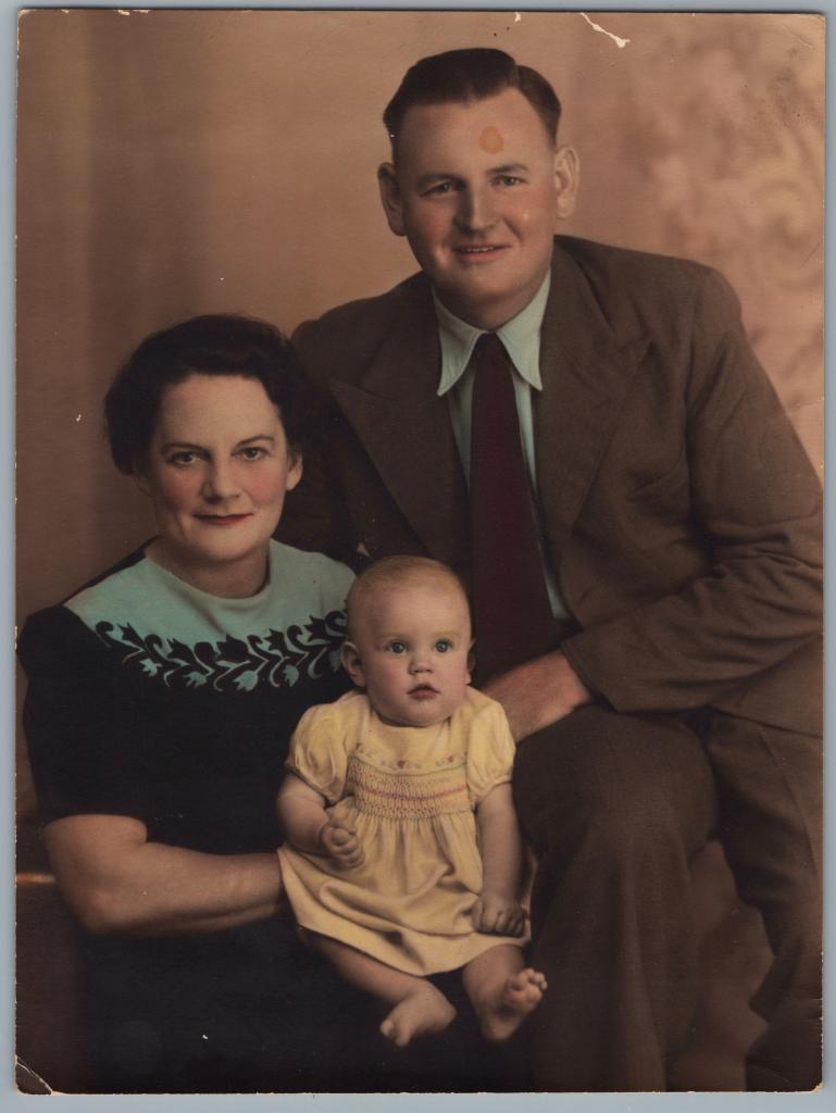 1945Digital coloured photograph of Dianne Colvin with her parents. Her mother Eileen is seated and wearing a black and blue/green dress. She holds baby Dianne who is wearing a smocked dress with coloured embroidery on the chest and sleeves. Her father Arthur is seen at the back leaning on the chair in a brown suit with blue tint shirt and tie.