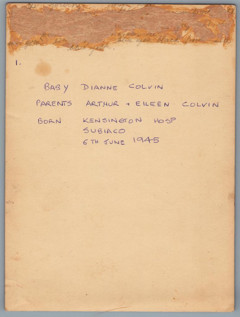 The reverse of the photograph has written in blue pen: 'Baby Dianne Colvin/ Parents Arthur + Eileen Colvin/ Born Kensington Hosp / Subiaco / 6th June 1945.