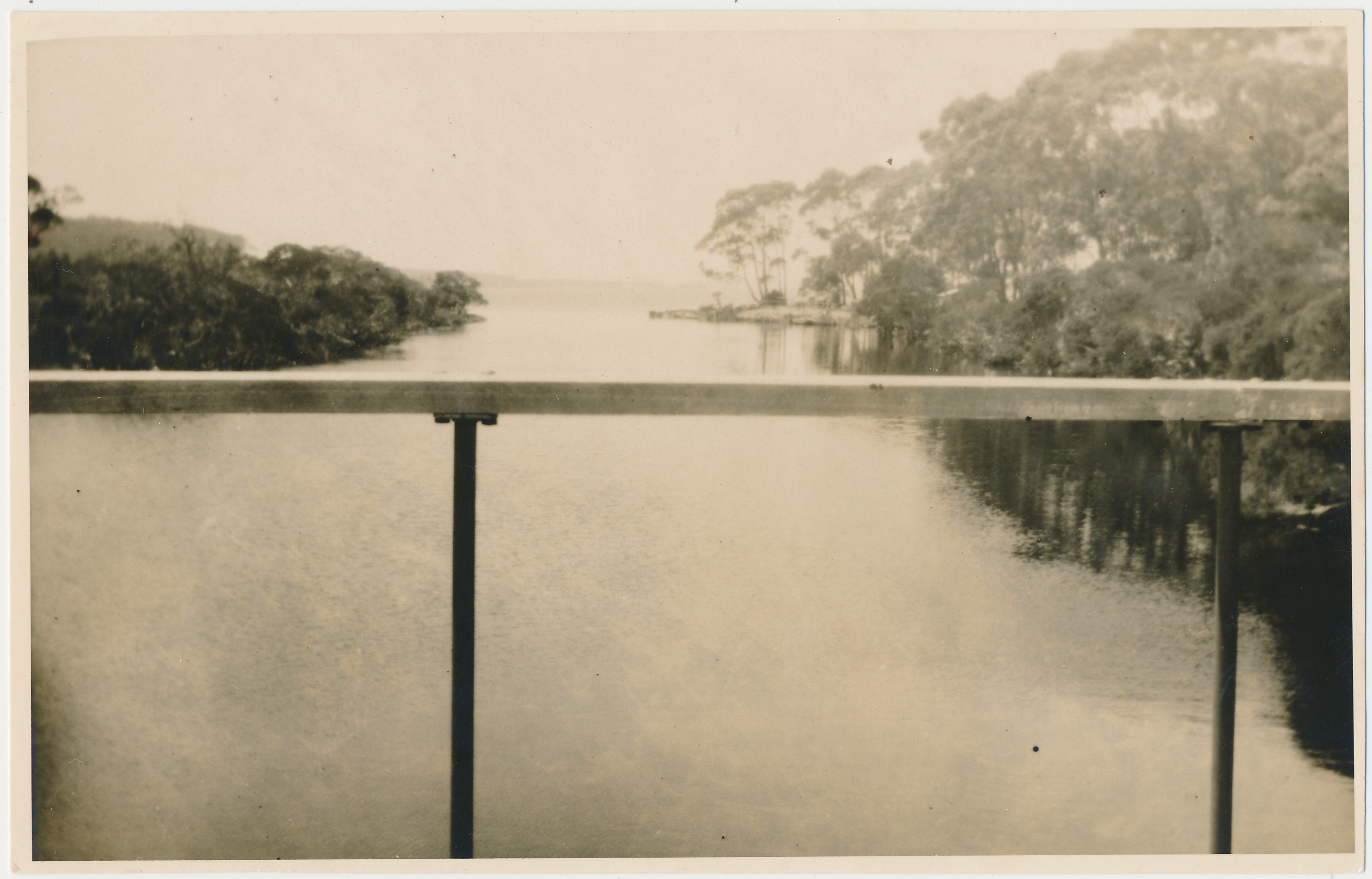 c. 1936A sepia photograph taken from a bridge looking down a river.