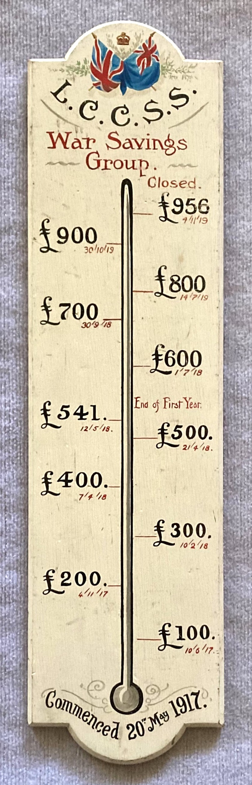 c. 1917 - 1919Painted timber War Savings Group plaque in form of thermometer which tracks the amount raised from the start of the campaign (20 May 1917) until the completion (4 November 1919).