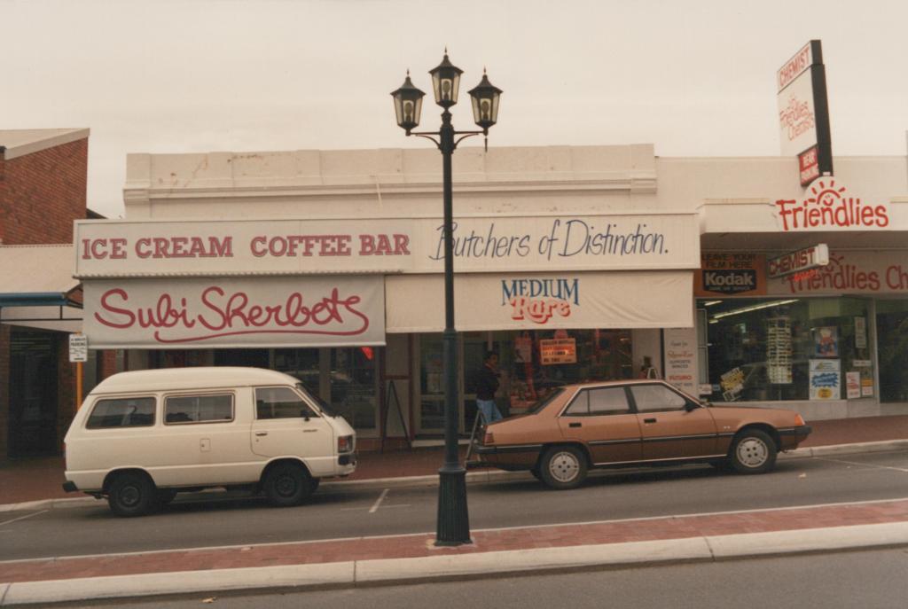 1988Coloured photograph showing an elevation of shops at 118 Rokeby Road. The buildings have verandahs and the shop names are seen on the verandahs. The shops listed from left to right: 'Subi Sherbets', 'MEDIUM RARE', 'KODAK' and ' Friendlies Chemist'. A couple of cars are parked in front of the shops. There is a street light in the middle of the image.