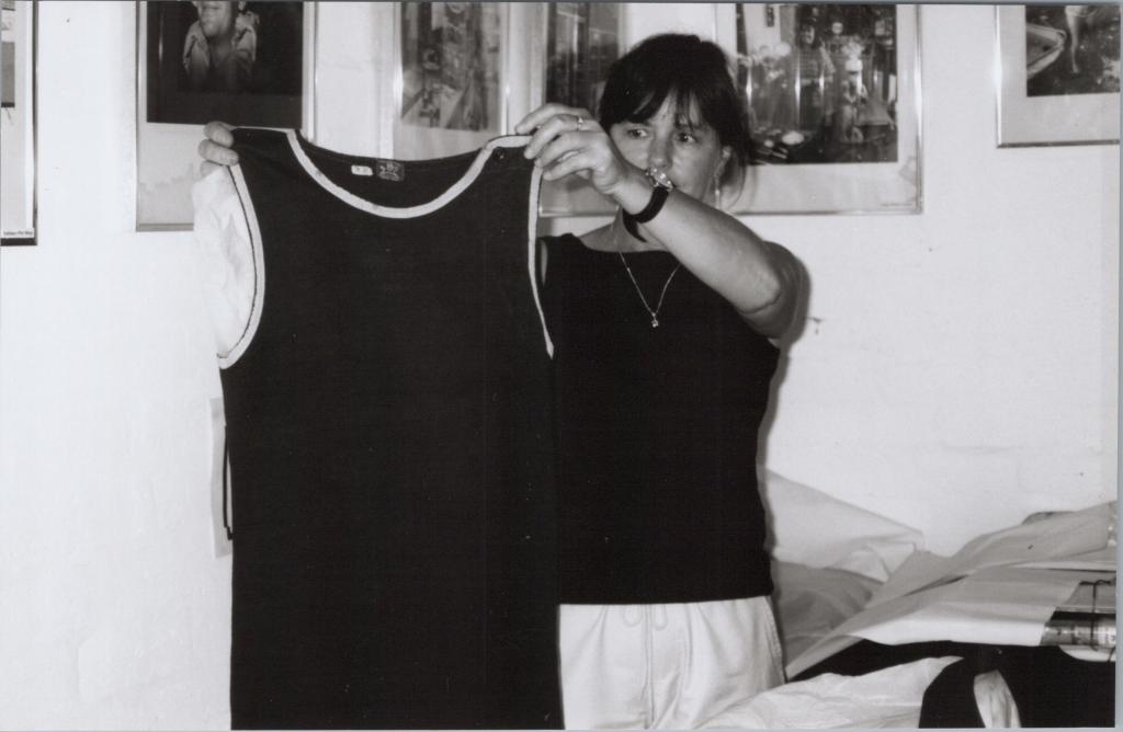 The photograph depicts a person, likely Patricia Moncrieff, holding up a sleeveless dark-coloured vest with white edging along the sleeves and collar. Other textiles are visible on a table to the right. There are framed images hanging on the wall behind.