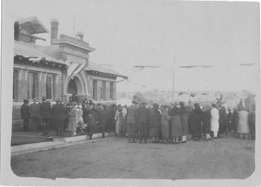 1926Celebrations of the opening of the Memorial Town Hall 1926 Note line of flags across High Street (or Albany Highway as it is in 2015). This is one of a series of 5 photos taken at the Memorial Hall's opening in 1926.