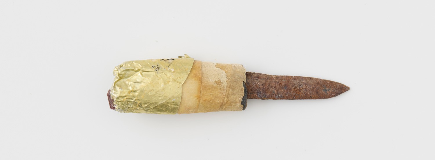 Small, heavily corroded, metal shiv with tape handle. Small, corroded, piece of metal fashioned into a long, tapered blade coming to a sharp point. The opposite end of the blade has a thick layer of cream and gold coloured, degraded, tape wrapped around it, forming an improvised handle.