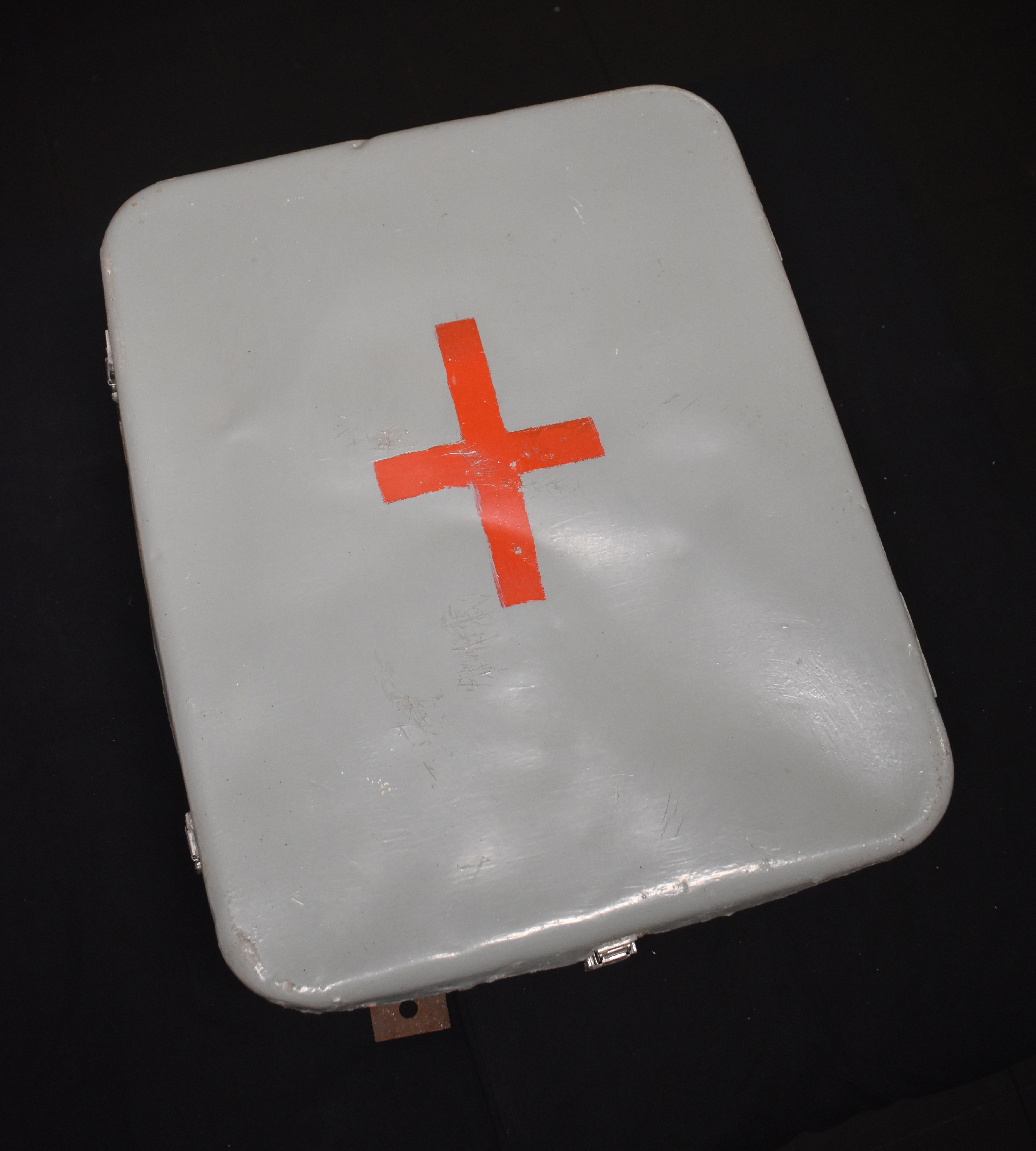 c. 1965Painted grey with red cross on front door which has two (2) swing hinges opening to reveal two (2) shelves. Inside has sheet of printed paper with box contents placed in plastic sleeve and fixed on back of door. Cabinet has four (4) latches to secure the door.
