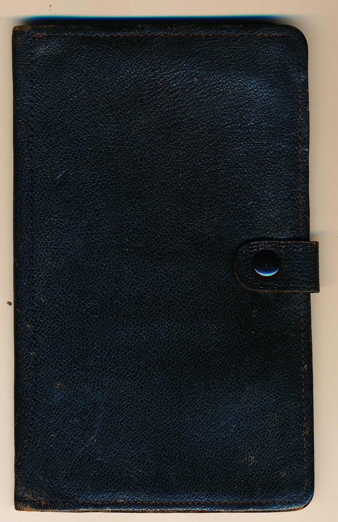 c. 1960A black leather wallet with three pockets, and an elastic band to secure notes in two of the pockets which have a blue material lining. It is opened and closed with a press stud, it contains a $1 Australian note and an airmail sticker in the middle pocket.