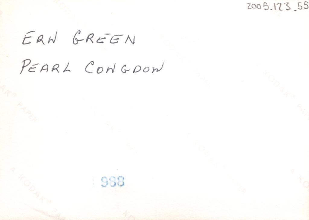 Reverse: Written in black pen is 'ERN GREEN', 'PEARL CONGDON'. There is a number stamped in blue ink, '988'.