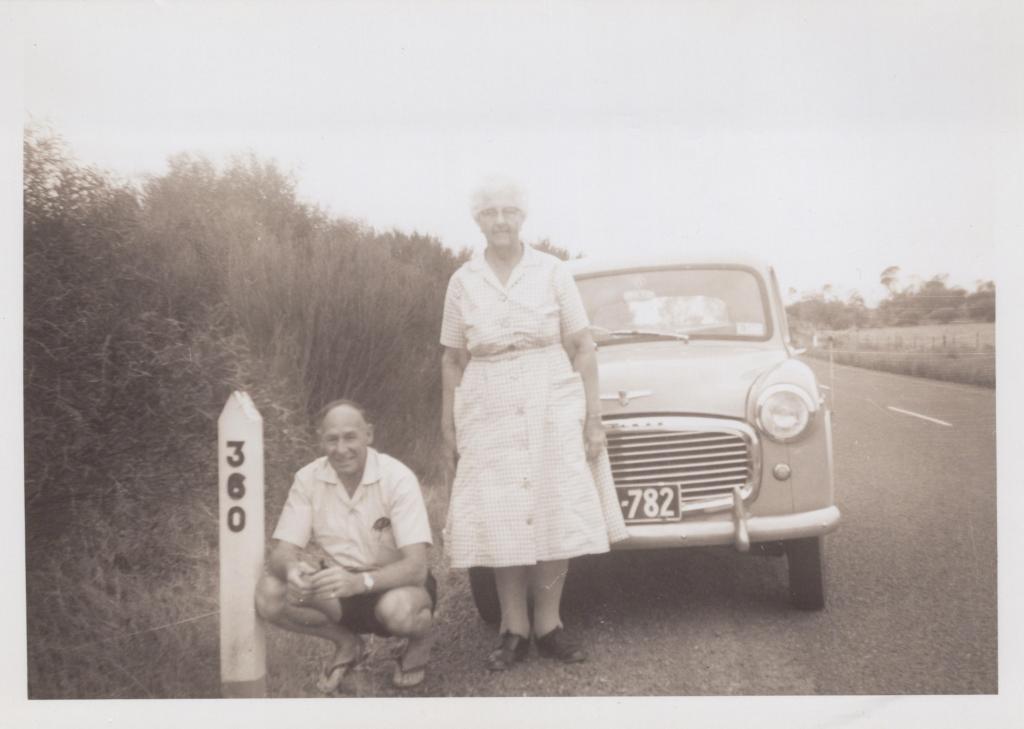 c. 1930Image: A photograph of Ern Green (left), and Pearl Congdon (right), standing the roadside infront of a car. Ern is crouched next to a short wooden post that has the number '360' on it, and is wearing a light coloured button down shirt, dark shorts and has thongs on his feet. Pearl leans against the front of the vehicle, and is wearing a light coloured button down dress. Behind them on the left are shrubs, and on the right there is a road.