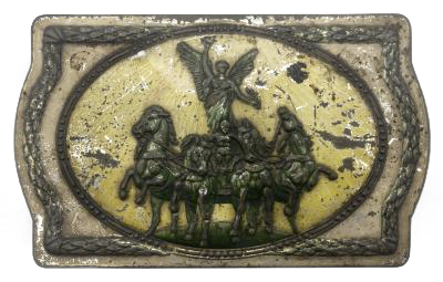 This example is worn and faded. Originally, the colours would have been quite vibrant - the sculpture and area on which it stands were green and the background was that of a sun and rays in bright yellow. The surrounds were fawn in colour with matching green and tellow decoration.