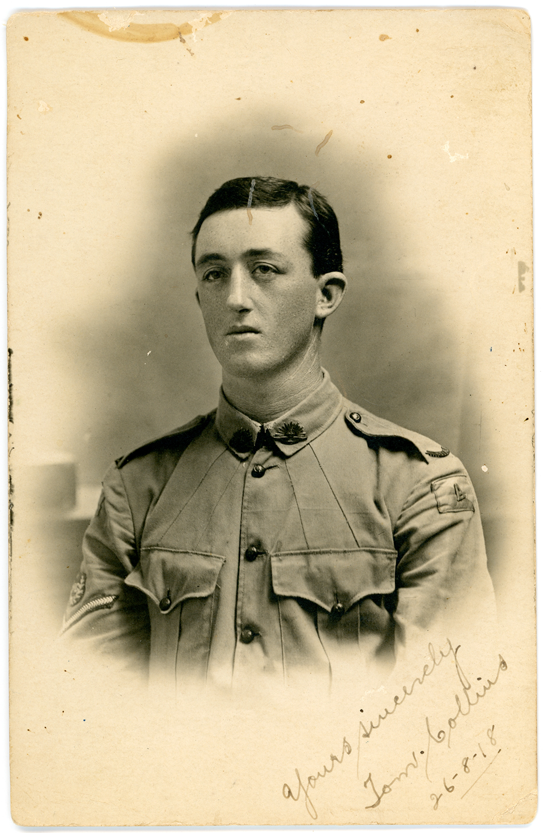 On the front of the photograph “Yours Sincerely / Tom Collins / 26-8-18”. On the reverse “TARJETA POSTAL POST CARD BILHETE POSTAL / CARTE POSTAL LEVELESO-LAP / COMMUNICATION ADDRESS / No 243 / SGT. F.E. BRUCE / 3rd AUS.M.GUN.SQDN”.
