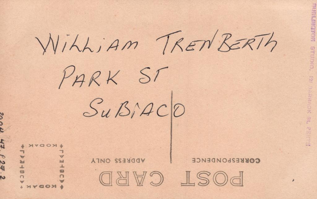 Reverse: Written in black pen 'WILLIAM TRENBERTH PARK ST SUBIACO'