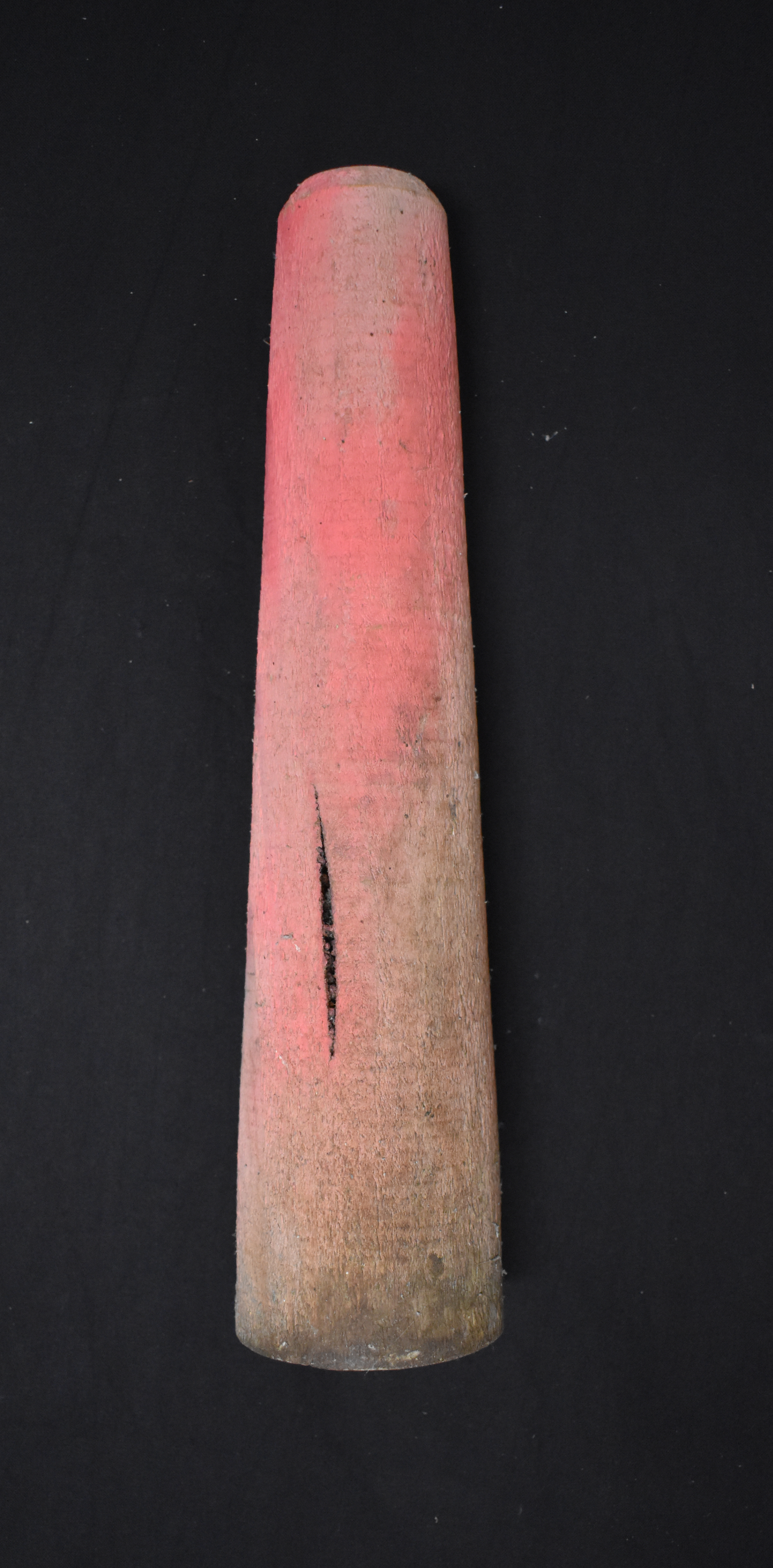 c. 1990Cone-shaped piece of wood with a larger circumference at the base and tapered to a smaller top. Sprayed with pink paint.