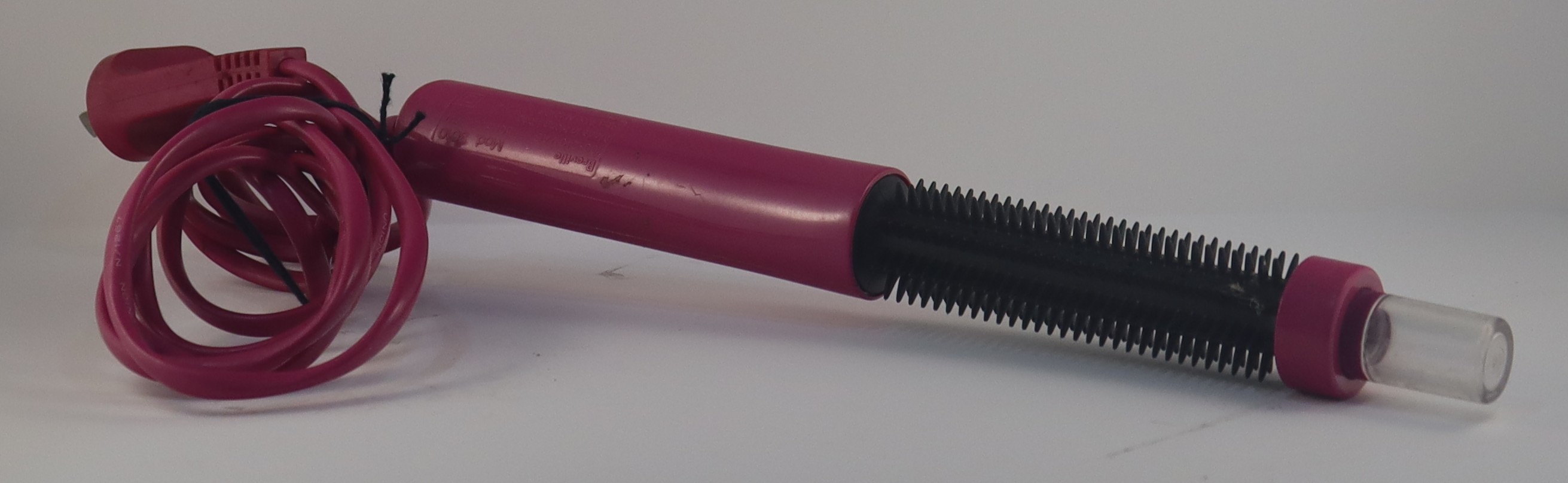 c. 1980A pink plastic handle with black circular brush at the other end. The item is electrical.