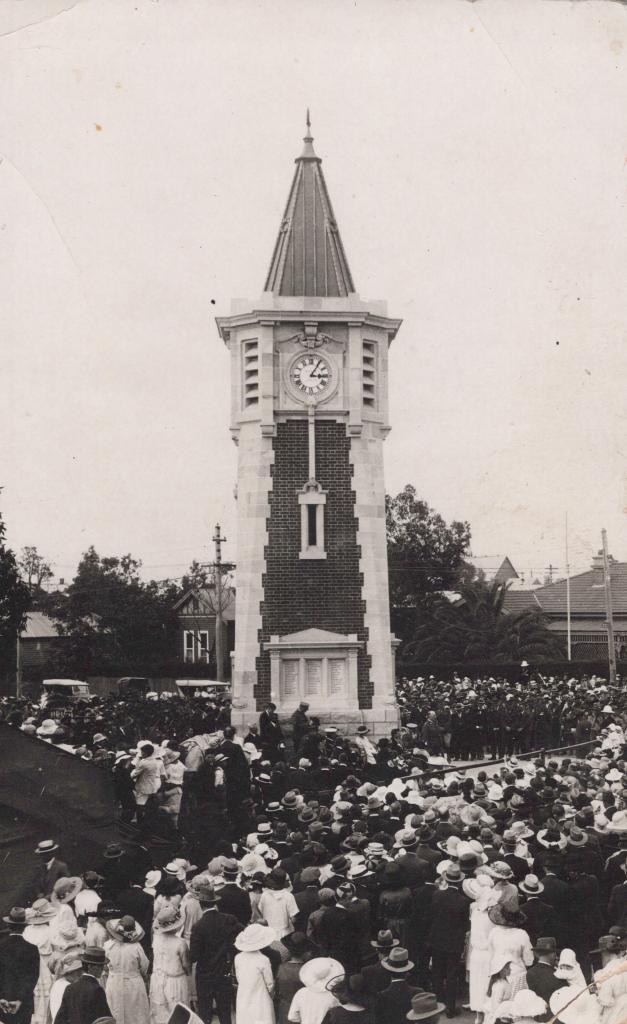1923Black and white portrait postcard depicitng the Subiaco Clock/War Memorial in the centre. Guests are seated in front and to the left of the clock. Spectators are standing in front and to the right of the memorial. All are wearing their best outfits with both men and women in hats.