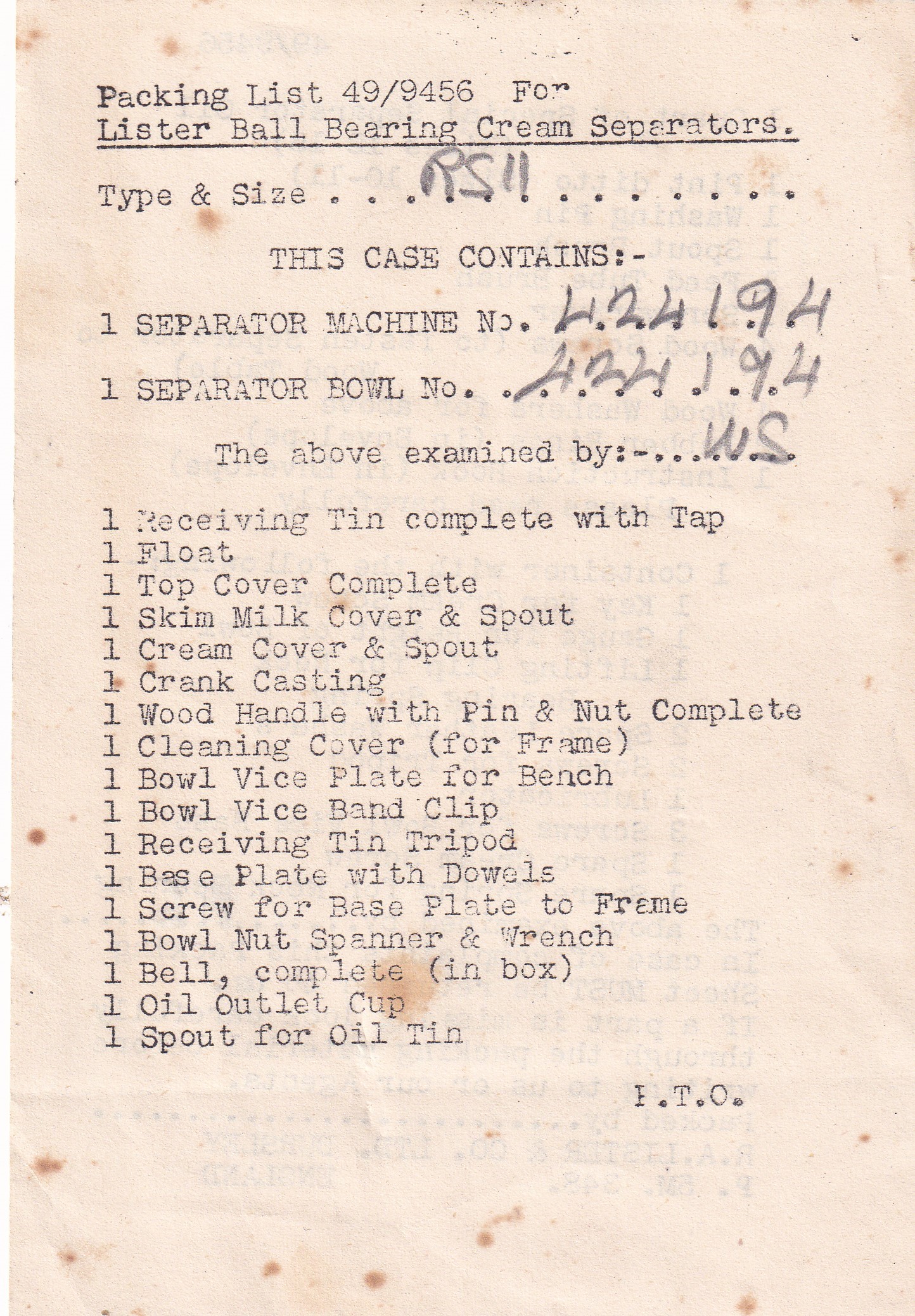 Cream Separators - Packing List only