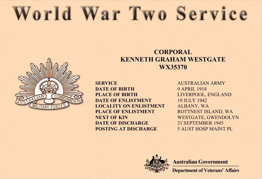 Corporal Kenneth Graham Westgate from Albany was serving on Rottnest as WP6085 when he volunteered for the Australian Imperial Force as WX35370 on 19 July 1942