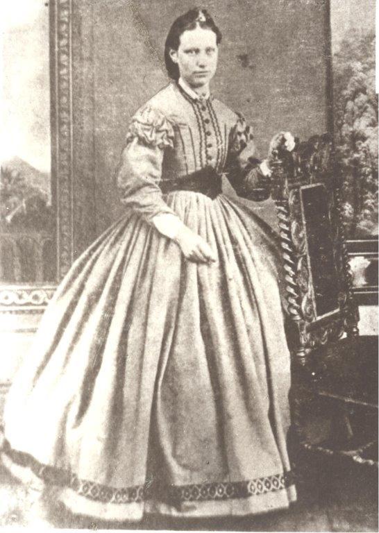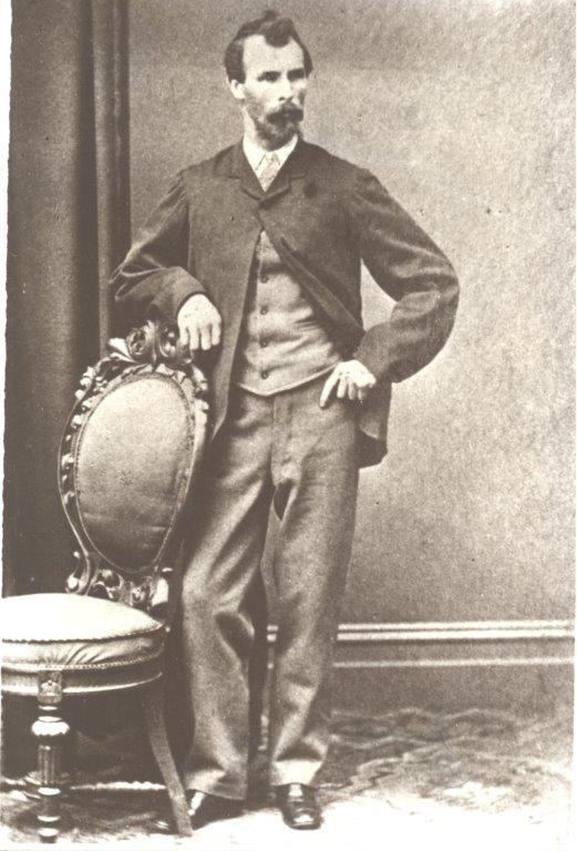 c. 1880B//W Prints of studio portraits. (a) James Bray with thick, dark, receding hair, full moustache and steadfast gaze is posed with one arm on the back of an ornate chair and the other bent to place his thumb in a trouser, pulling back his single-buttoned jacket to reveal a lighter, buttoned waistcoat. One knee is bent and his trousers partly cover shiny boots. (b) Abigail Bray is dressed in a typical Victorian outfit: full skirt, tight-fitting, buttoned bodice with high neck, dropped shoulders and long sleeves, with white collar and false sleeve visible at the wrists. She wears a tight, shaped belt and the outfit is trimmed with braid and ruffles. Her dark hair is parted in the centre and she is posed with one hand on the back of an ornate chair.