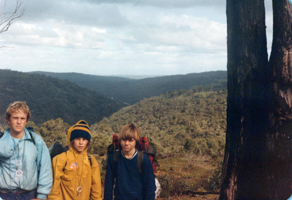 A coloured photograph showing three boys pictured on the left side of the photograph standing in front of several hills covered in bushland. The boy on the far left is the tallest and wears a light blue jacket and jeans. The boy in the centre wears a yellow jacket and a yellow striped beanie, and the third boy on the right wears a navy blue jumper with a white neck stripe and a red backpack. There is a large tree trunk that runs the length of the photograph on the far right side.