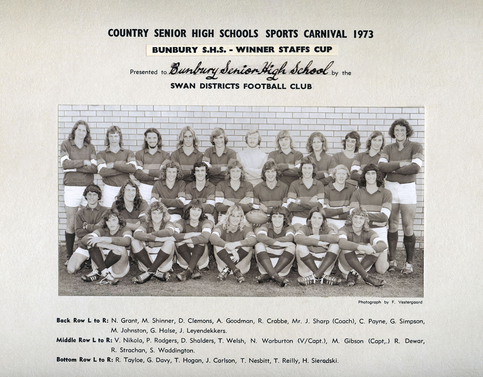 Group photograph of the football eighteen that competed at the 1973 Country Senior High Schools Sports Carnival. The team were the champions and the winner of the Staffs Cup.