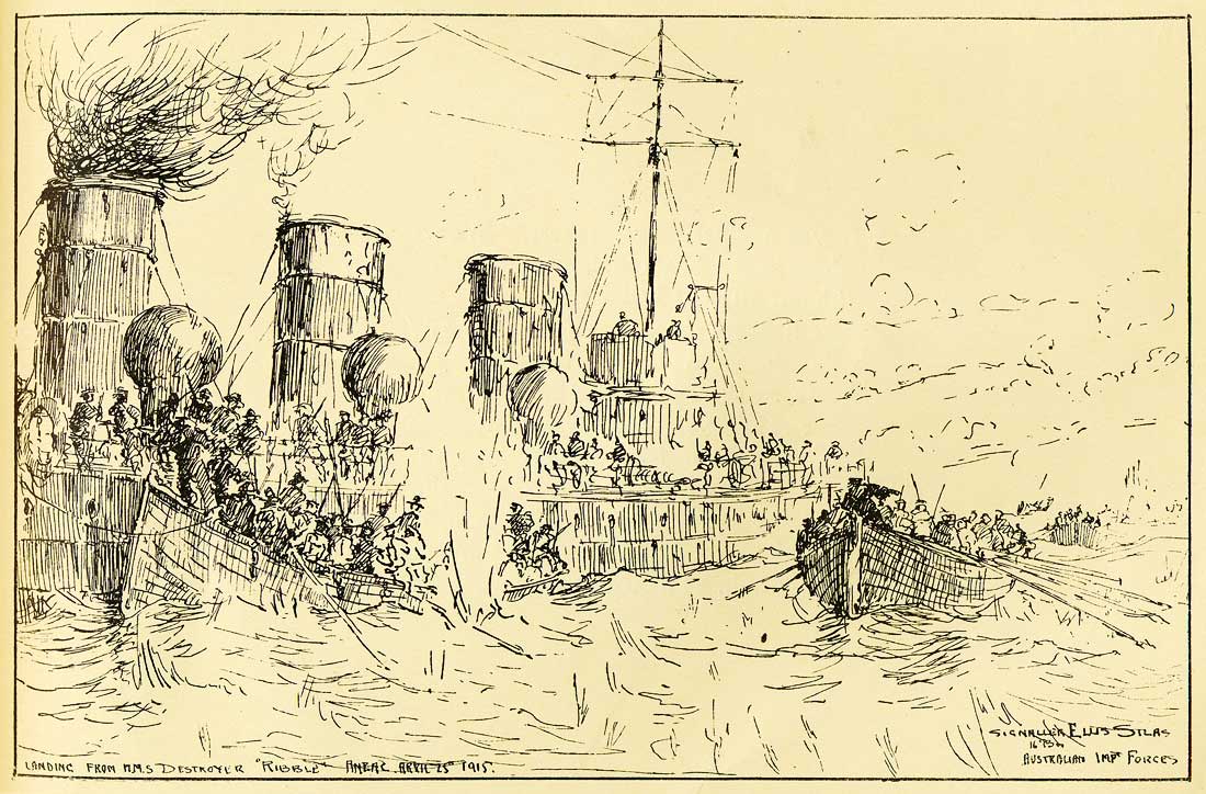 We were transferred from the transport to the destroyer, which took us close into the shore, and then we were transferred into the ship's boats and rowed to the shore, amidst a hail of shells. Gallipoli, April 25th, 1915-