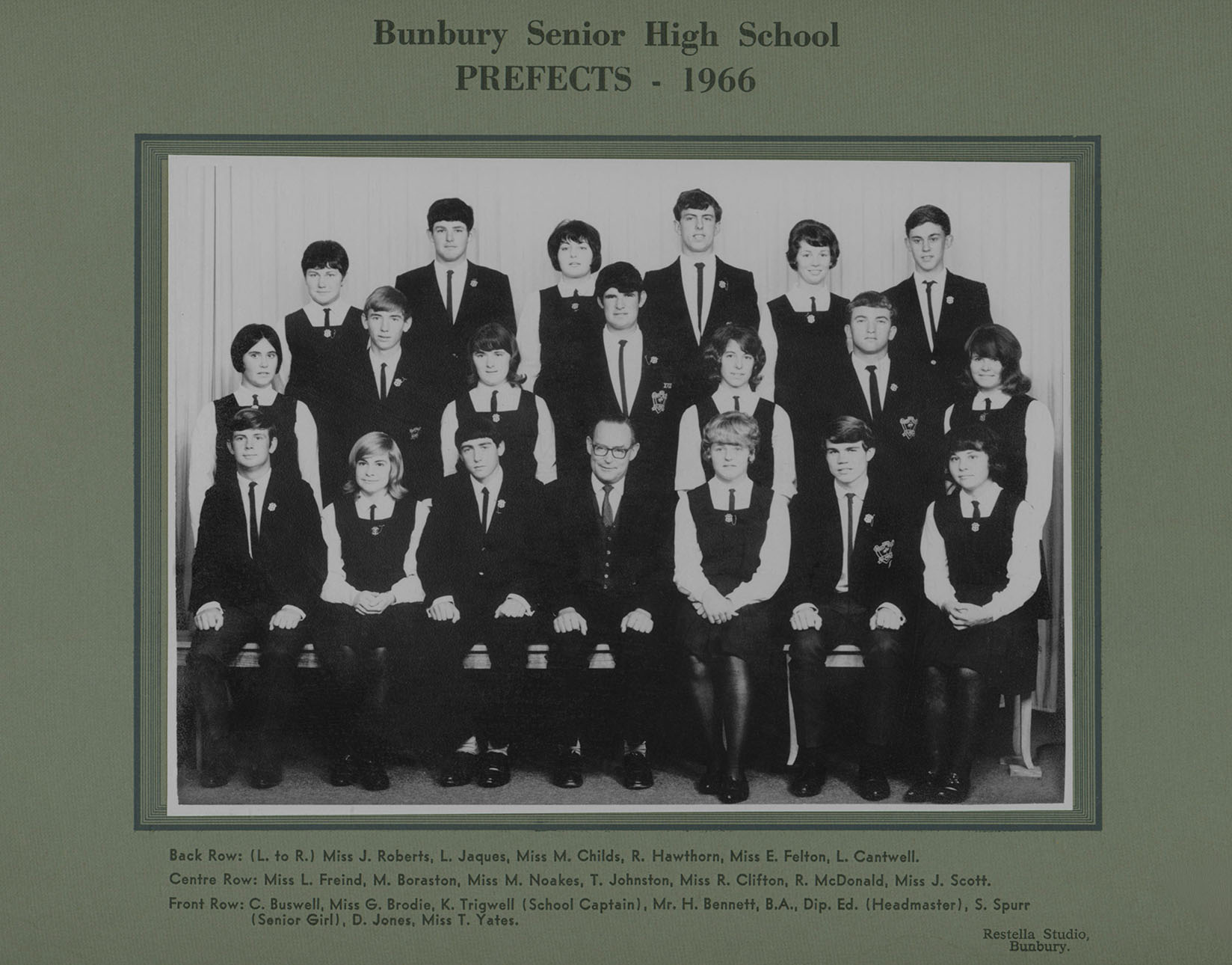 1966Studio portrait of the 1966 Bunbury Senior High School Prefects with principal Harry Bennett.