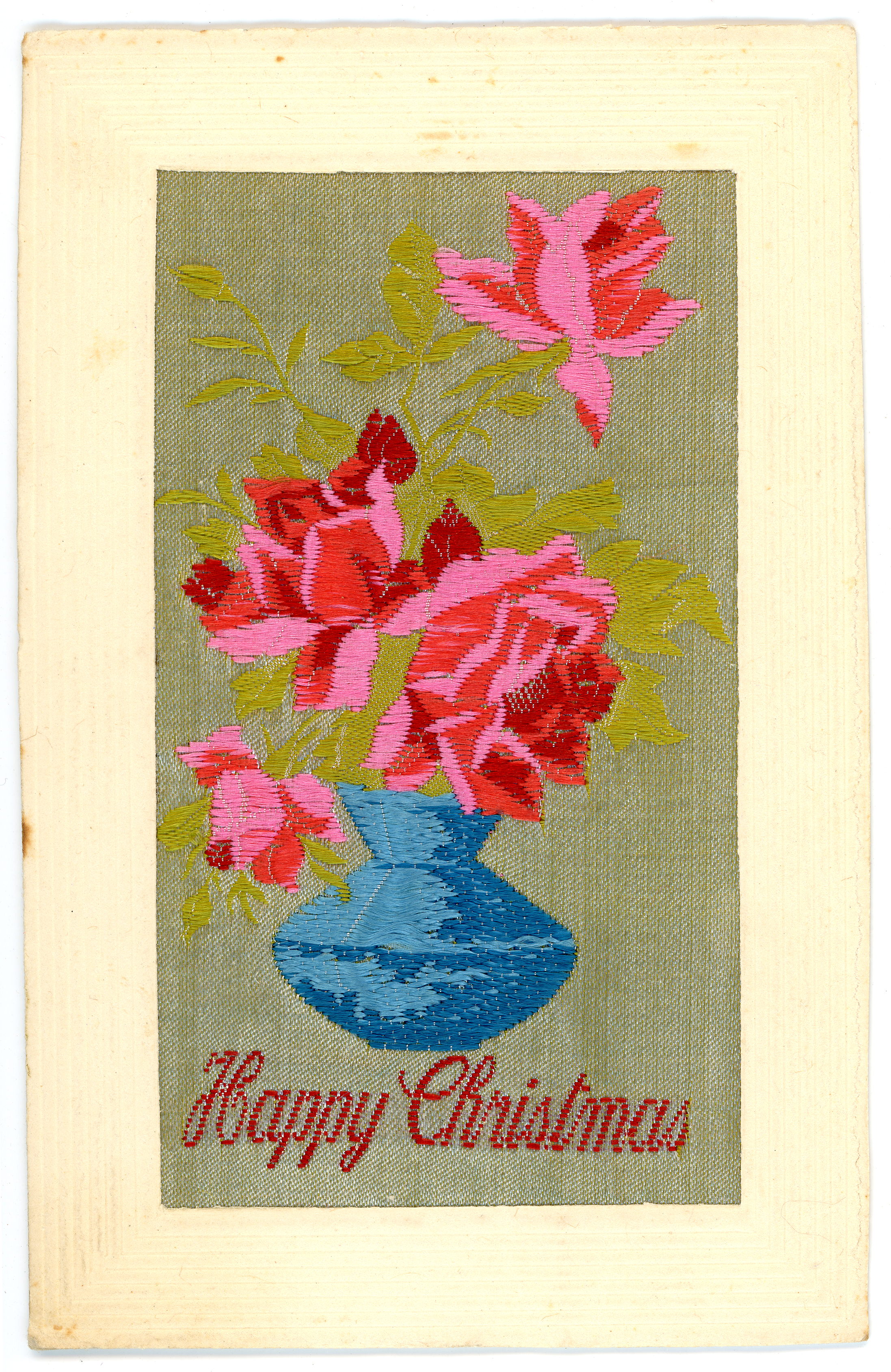 c. 1916Postcard with embossed card border on front with machine embroidered silk insert. Designed with a blue vase filled with large red and pink flowers and ‘Happy Christmas” across the bottom in cursive writing. Printed postcard markings on back in black ink and handwritten in pencil a brief personal note.