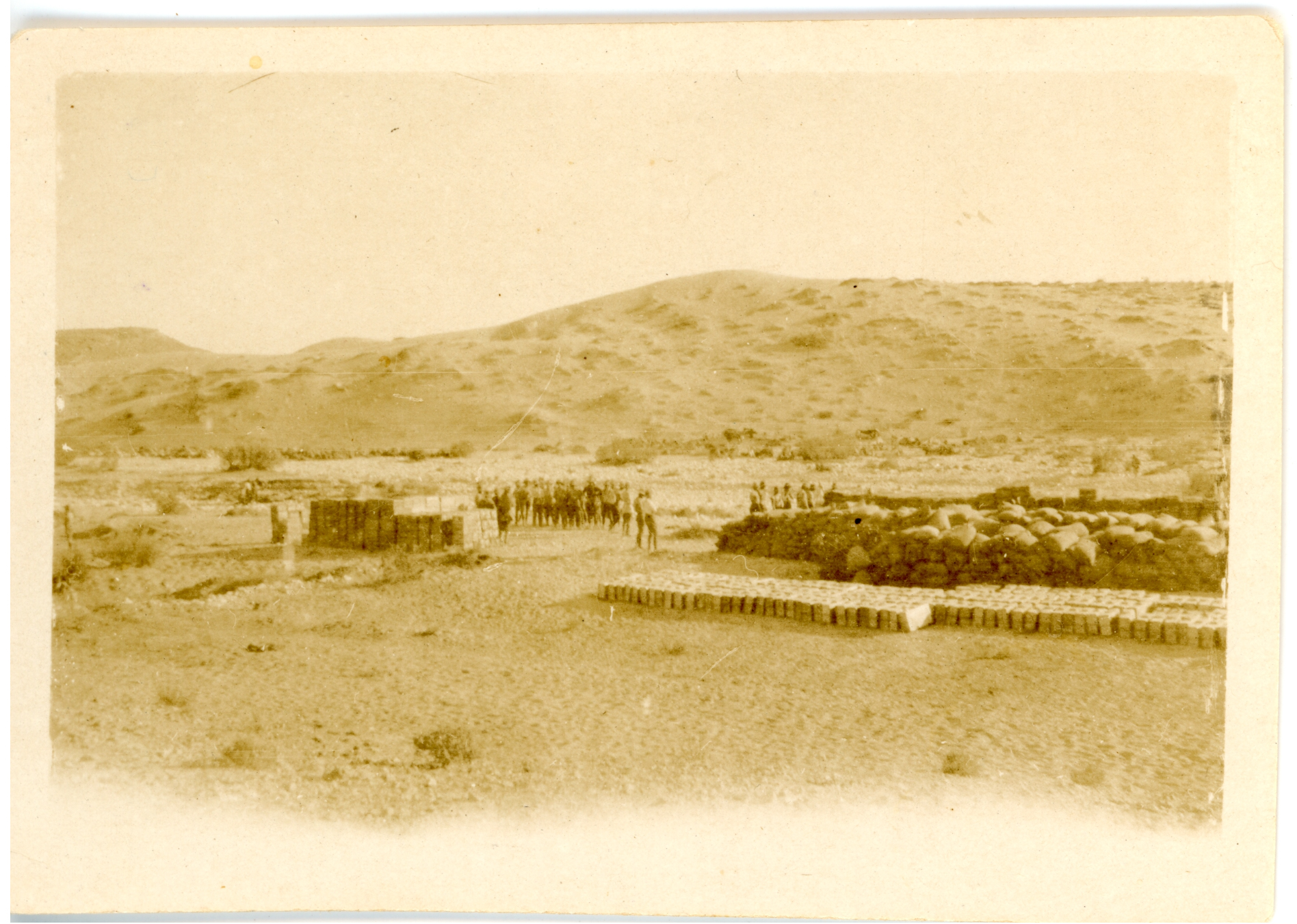 1916 - 1918A small black and white photograph showing a group of soldiers standing casually in the desert near various supplies. There is a large hill in the background. The photograph has a small border and is in good condition, although there are marks on the right-hand side of the image possibly from its development. There is a small number 1 written on the reverse top corner.