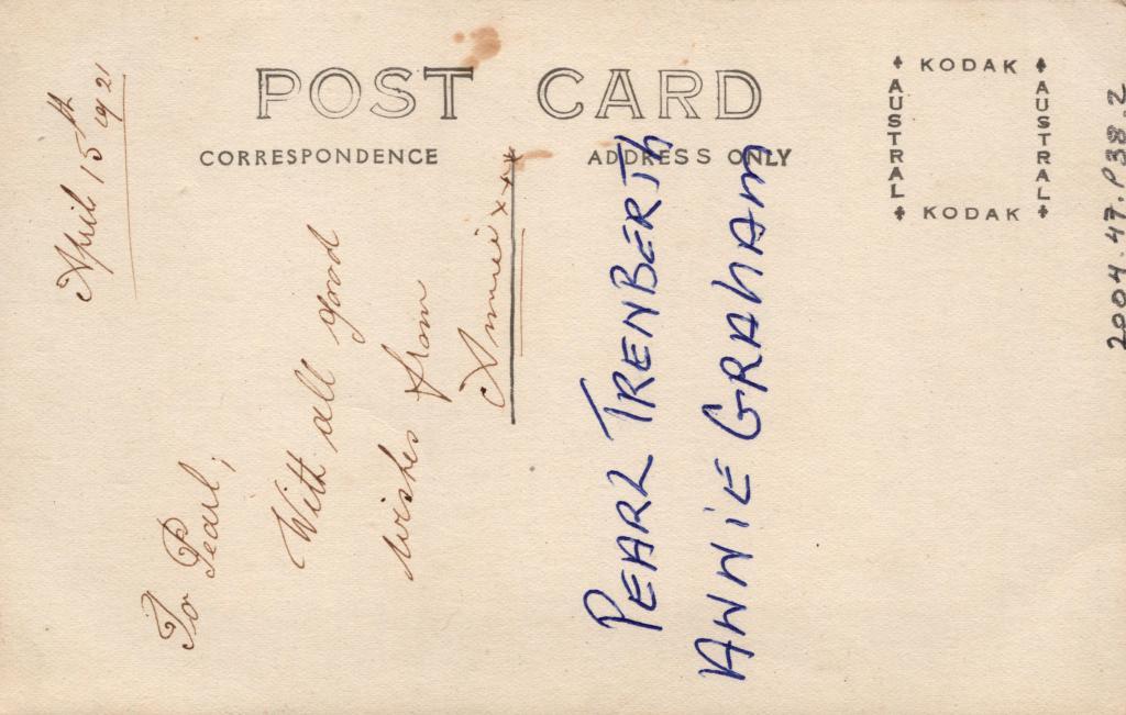 Reverse: Written in black pen 'April 15th 1921 To pearl: wih all good wishes from Annie xxx' and written in blue pen 'PEARL TRENBERTH ANNIE GRAHAM'