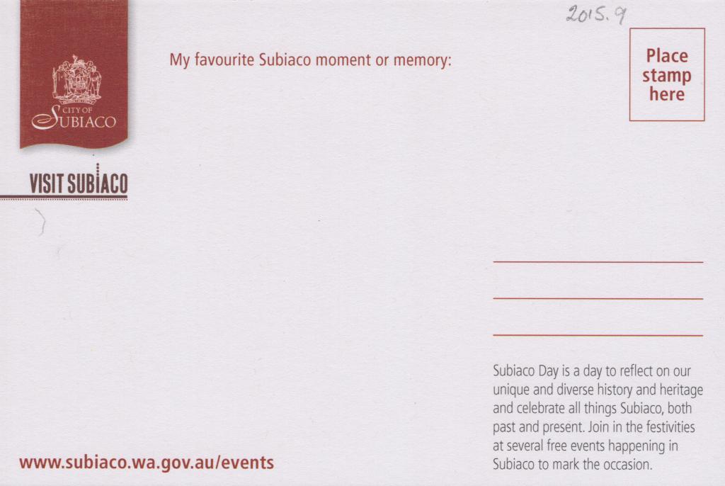 The reverse is white in a postcard format with the Subiaco coat of arms in a red rectangle with a wavy bottom at the top left. Across the top is 'My favourite Subiaco moment or memory:' Bottom right corner desrcibes the celebration: 'Subiaco Day is a day to reflect on our / unique and diverse history and heritage / and celebrate all things Subiaco, both / past and present. Join in the festivities / at several free events happening in / Subiaco to mark the occasion.'