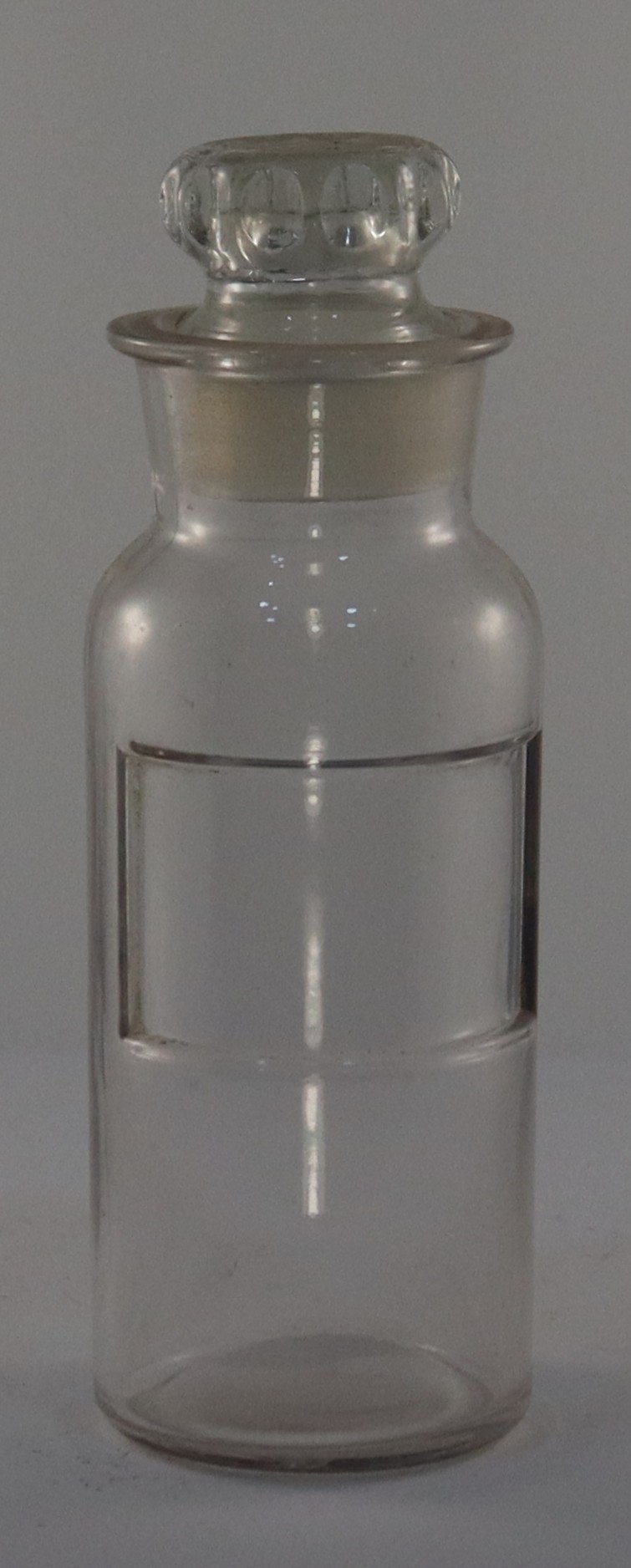 A clear circular glass bottle with a glass stopper. The bottle has a gold label with a red border and black lettering.