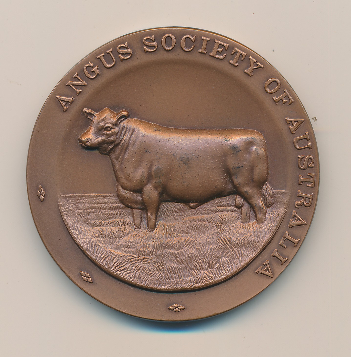 Around the edge of the front of the medal is embossed "ANGUS SOCIETY OF AUSTRALIA".