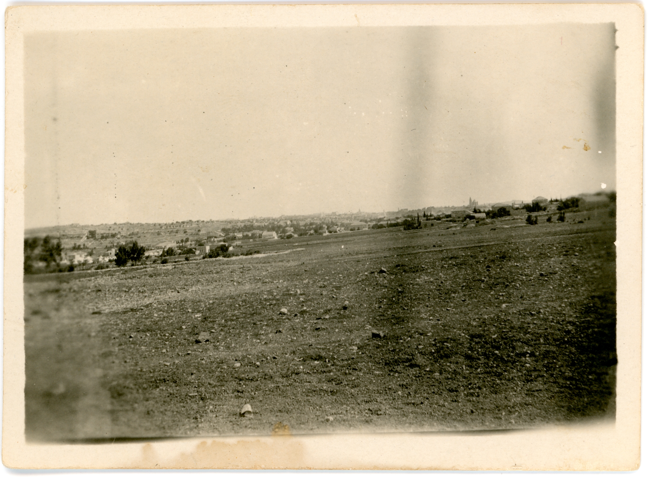 1917A small black and white photograph showing the rural outskirts of a city. The land at the forefront of the image is stony and there is nothing growing. In the distance trees can be seen and several houses. Further back in the image, the number of houses increases and, on the horizon, large buildings and towers can be seen. The reverse of the image has the proforma printing of part of a postcard and an inscription. The photograph has a small border and is in good condition, although there is a small stain along the bottom that shows front and back.