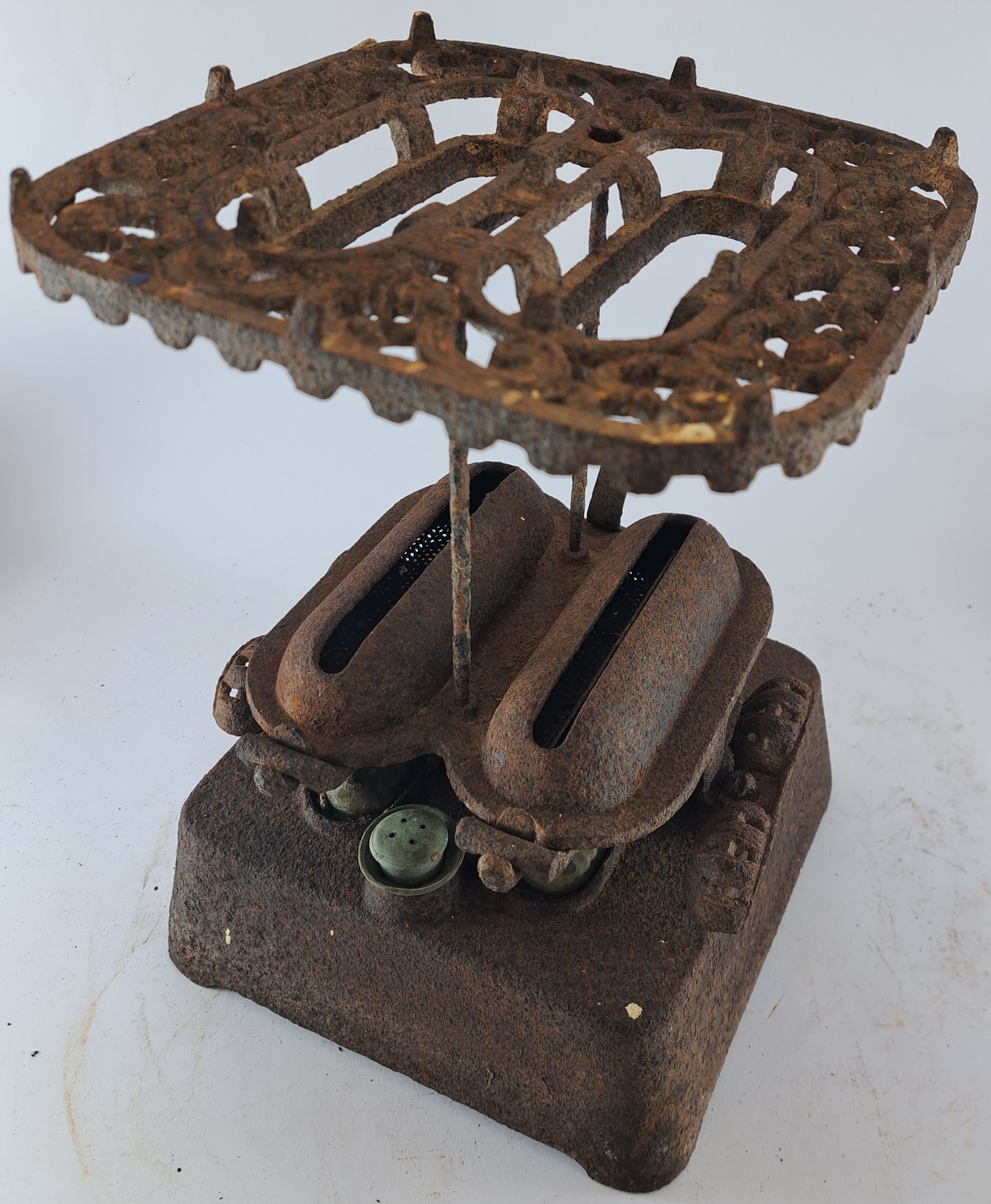 has a very ornate griller type top on 2 metal 15cm poles and underneath this are 2 long open slotted receptacles that hold wicks which has turning knobs on the ends to adjust wicks and has a press down lever to raise wick section to enable a flame to be ignited, presume it's of cast iron and either used to heat flat irons or functioned as portable cooking stove. also presume it uses Kerosene for fuel.