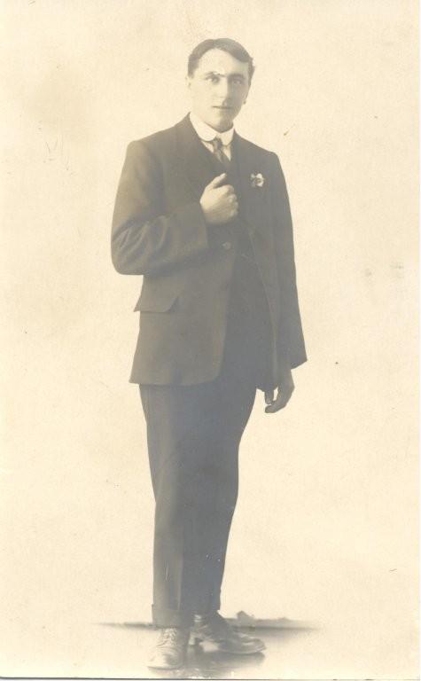(a) B/W post card. A full length studio photo of Jack Griffiths in a dark three piece suit with white collar and dark tie, He is wearing a watch chain with a cross and a flower in his button hole. He is standing with his hand on a pedestal and there is a aspidistra in a pot on the floor. Embossed on the left bottom corner is [Ford Studios, Bunbury] (b) A B/W postcard. A full length image of Jack Griffiths in a dark three piece suit, collar and tie and a buttonhole. Written on the back in lead pencil is [Griffiths 6 plate] and a red ink stamp [DEASE STUDIO, BARRACK ST., PERTH.] There is insect damage on the right eye.