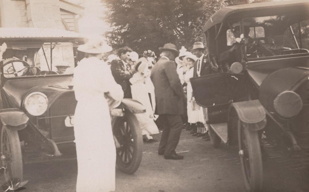 c. 1913Postcard showing two cars and a group of people.