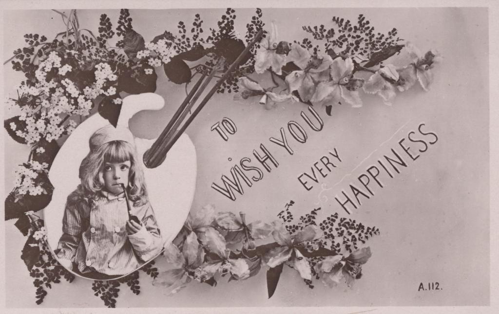 c. 1913Postcard decorated with flowers. An image of a child is on the card. The text 'TO WISH YOU EVERY HAPPINES' is seen.