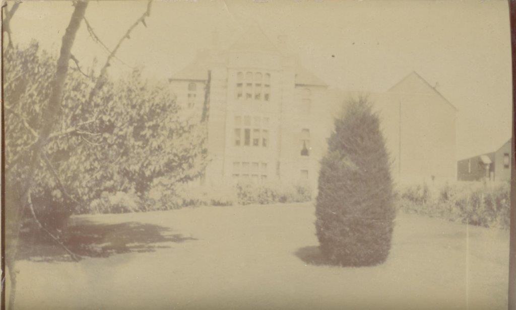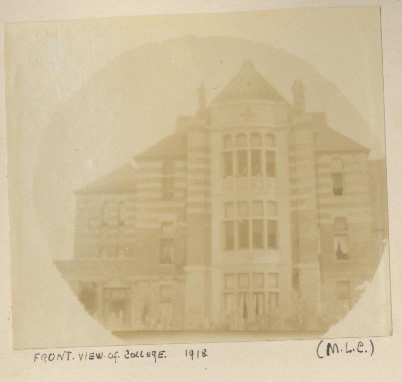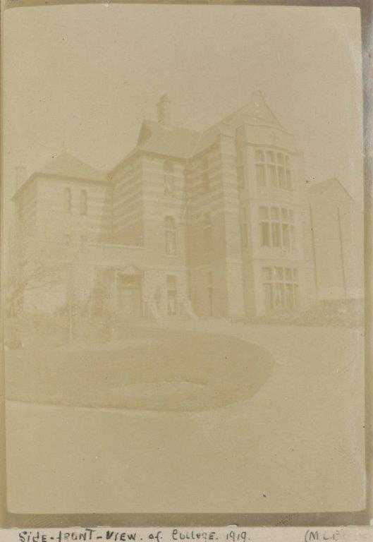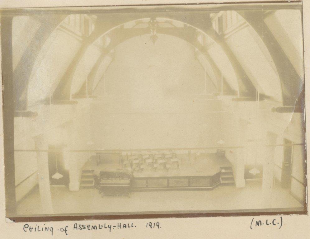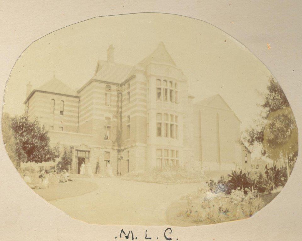 Five sepia prints. (a) Front view of three storey building with banding, bay windows, steeply gabled roof and chimneys and the rear of a substantial building on the right. Several people are near the doorway.There is a central drive in the foreground, shrubbery to the right and trees on the left under which girls are sitting on the grass. The image is in a crudely cut oval with [M.L.C.] under it. (b) Closer view of the building and bay window. Printed beneath image [FRONT VIEW OF COLLEGE. (M.L.C.)]. (c) View of lawn with tree, shrub and young conifer. Building in the background. (d) Drive curving around a lawned area to the entrance of the building. Printed below [Side - Front - View of College 1919. (MLC)]. (e) View of interior of hall with vaulted ceiling, stage with steps on either side and a piano in front of the stage. Printed below [Ceiling of Assembly-Hall. 1919. (M.L.C.)].