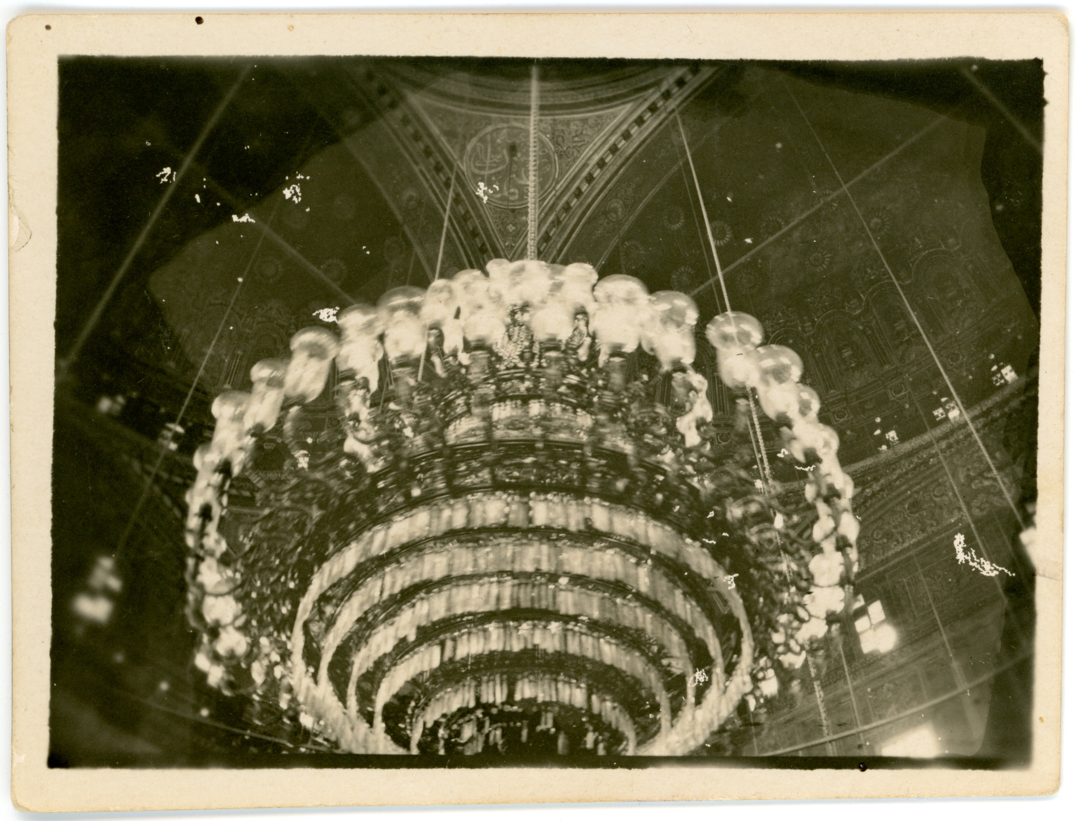 1915 - 1919A small black and white photograph showing the large chandelier located inside of the mosque in Cairo. The image is dark but the ornate chandelier can be seen clearly hanging from the roof of the dome.