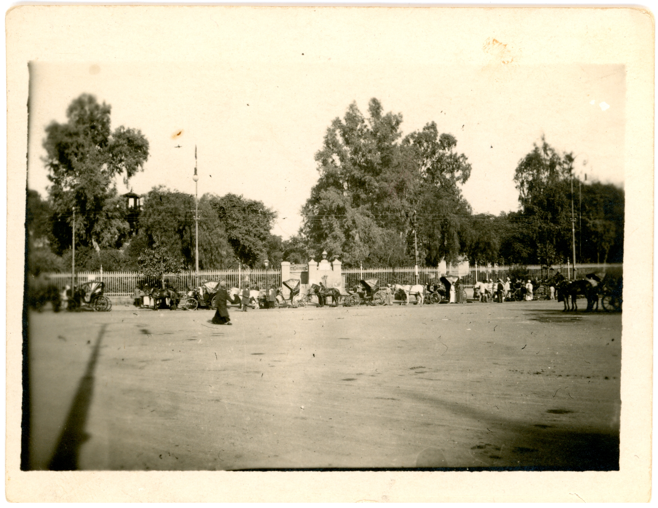 1915 - 1919A small black and white photograph showing a group of gharries with their drivers waiting to be hired. All the carriages are lined up outside of an ornate metal fence surrounding formal gardens. Part of the fence contains a brick structure with lamps atop. There is a large flat area of ground at the front of the image and a number of people are either walking by or waiting by carriages. A tower can be seen at the back of the image in the gardens. The reverse of the image has the proforma printing of part of a postcard and an inscription. The photograph has a small border and is in good condition with just a small red mark on the reverse