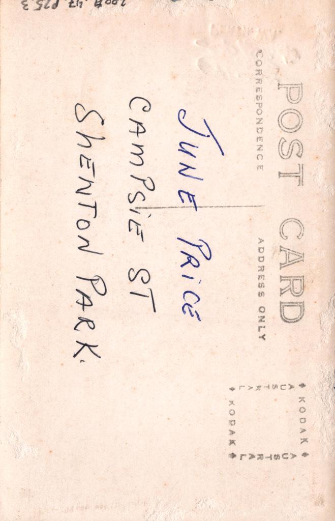 Reverse: Written in blue pen 'JUNE PRICE' and written in black pen 'CAMPSIE ST SHENTON PARK'