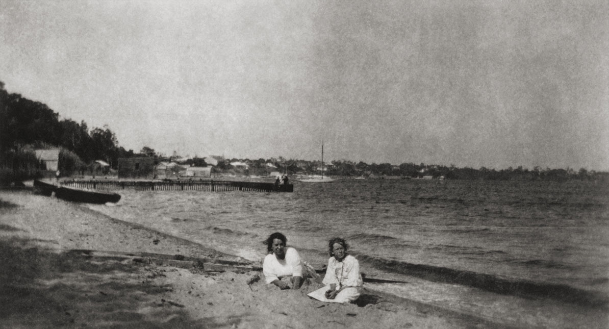 Ruby Barron (with legs buried in the sand) and Olive Shaw on the beach with boatsheds, jetties and baths in the background to the east.