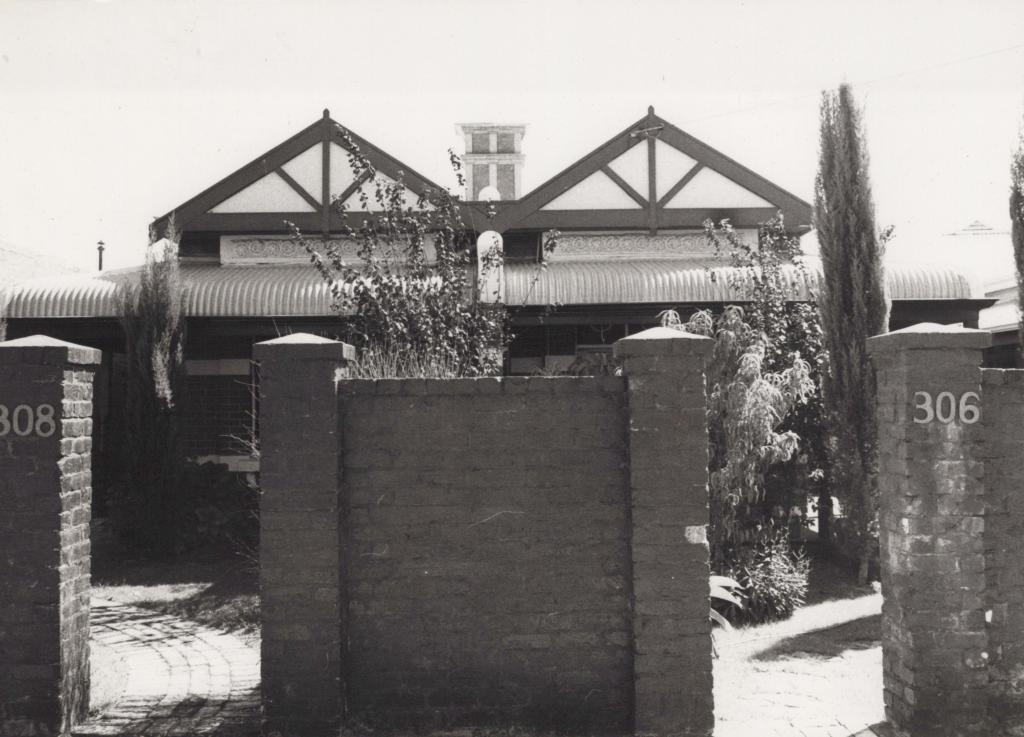 1985Black and white photograph of the houses 306 and 308 at Bagot Road. This is a conjoined residency. The houses are connected and share a brick chimney which is seen in the middle of the image. The houses are made of bricks. The roofs of the houses are both picked. There is a bull nosed verandah with a tin roof. In front of the houses, there is a brick wall with two openings. The number '308' is seen on the brick wall to the left in the image. The number '306' is seen on the brick wall to the right in the image. There are bushes and trees in between the houses and the brick wall, partially covering the houses.