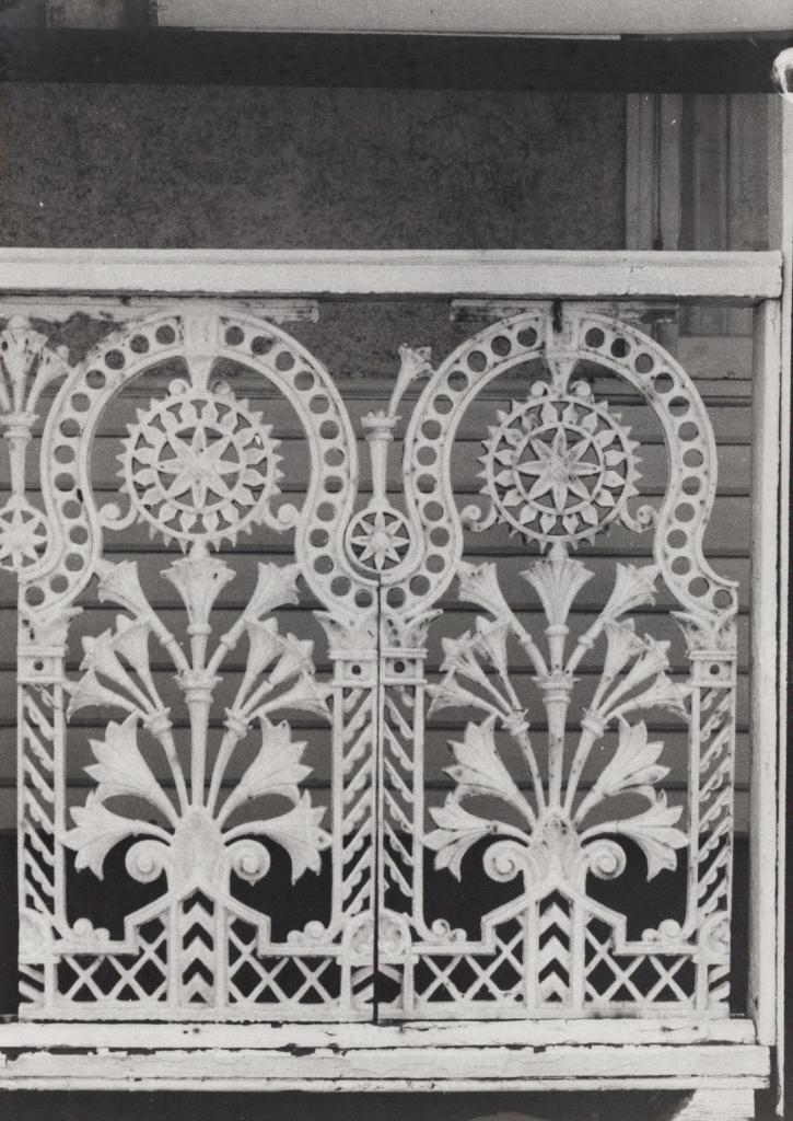 1985Black and white photograph of details on an unknown house at Eric Street, Cottlesloe. The image shows a white detailed lattice framwork, possiby part of a fence.