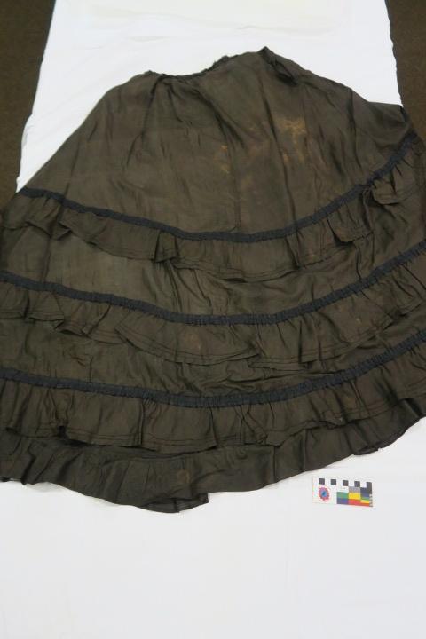 (a) blouse; (b) skirt Made of black silk Blouse has mutton chop sleeves wide cuffs hook and eye closures . Round neckline horizontal pin tucks form a yoke with vertical pin tucks down front to a curved gathered hem. Closes centre back with black buttons and tie ribbons at waist . Skirt is full 3 flounces with an extra gathered strip added making up the bottom half of the skirt . Closes centre back with hooks and hand stitched eyelets