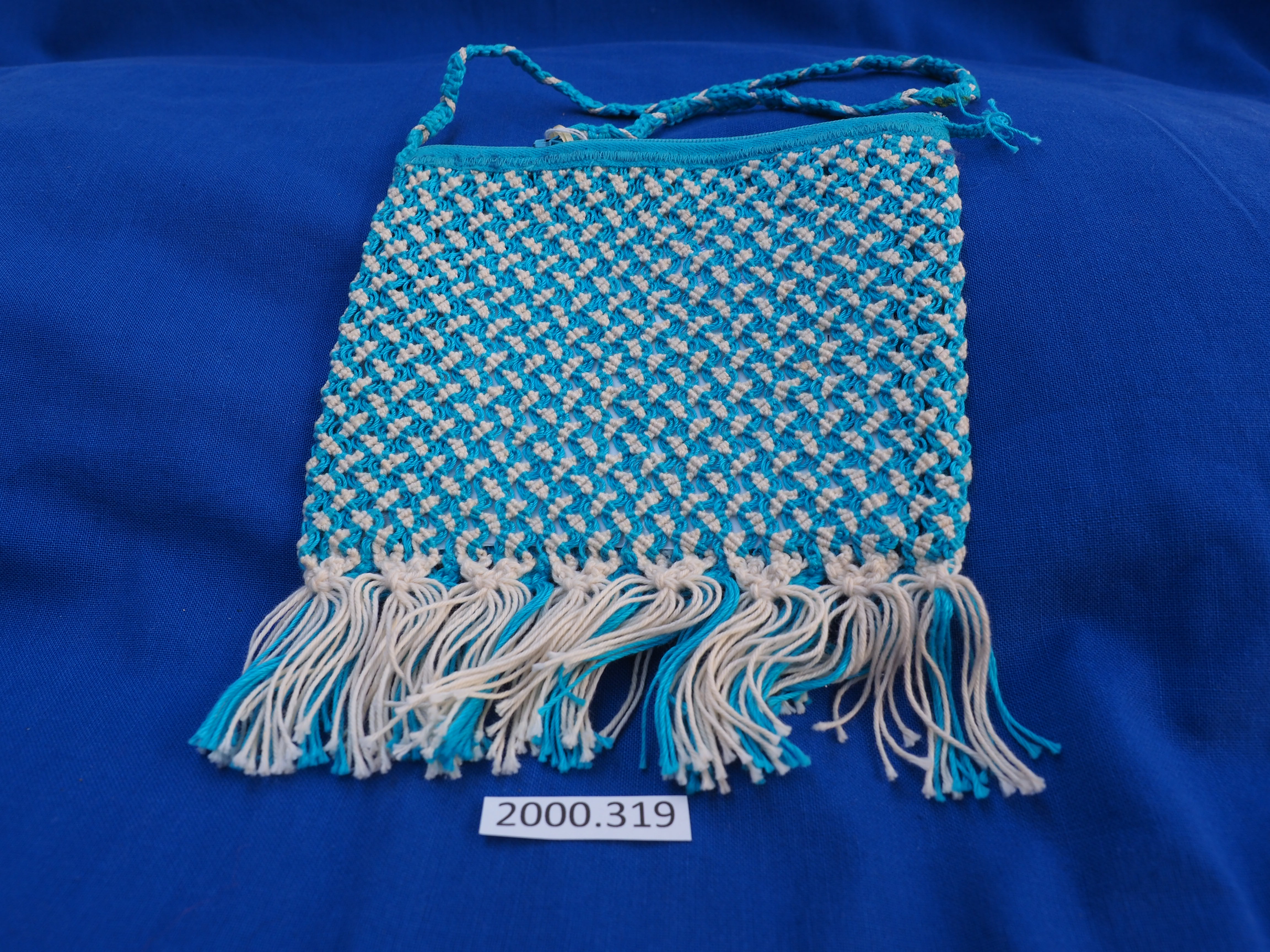 The blue and white bag with fringed edging has a macrame handle and blue zip closing.