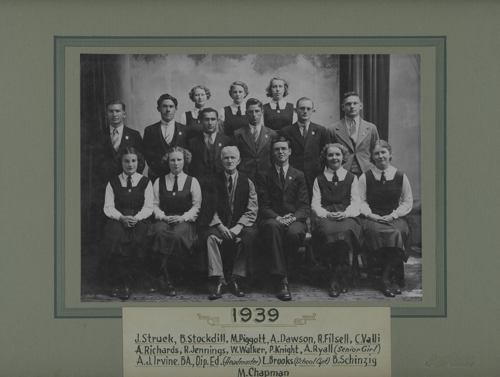 Sitting: Pamela Knight, Athalie Ryall (Senior Girl), Arthur J Irvine (Headmaster), Lance Brooks (School Captain), Bessie Schinzig, Myrtle Chapman